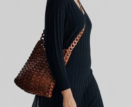 Made in Italy, from a soft blended yarn in a brown/ecru ridged weave... Loose fitting Contemporary length