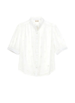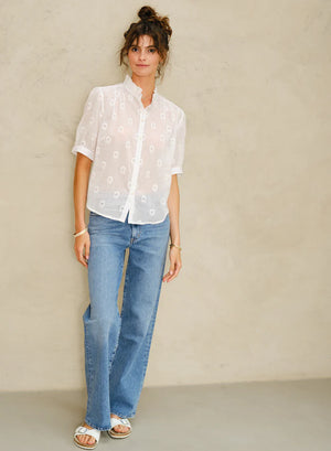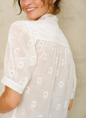 Tonal woven-floral motif in white cotton - perfect as a summer top or under a jacket throughout the year Frilled collar and pretty half sleeves...